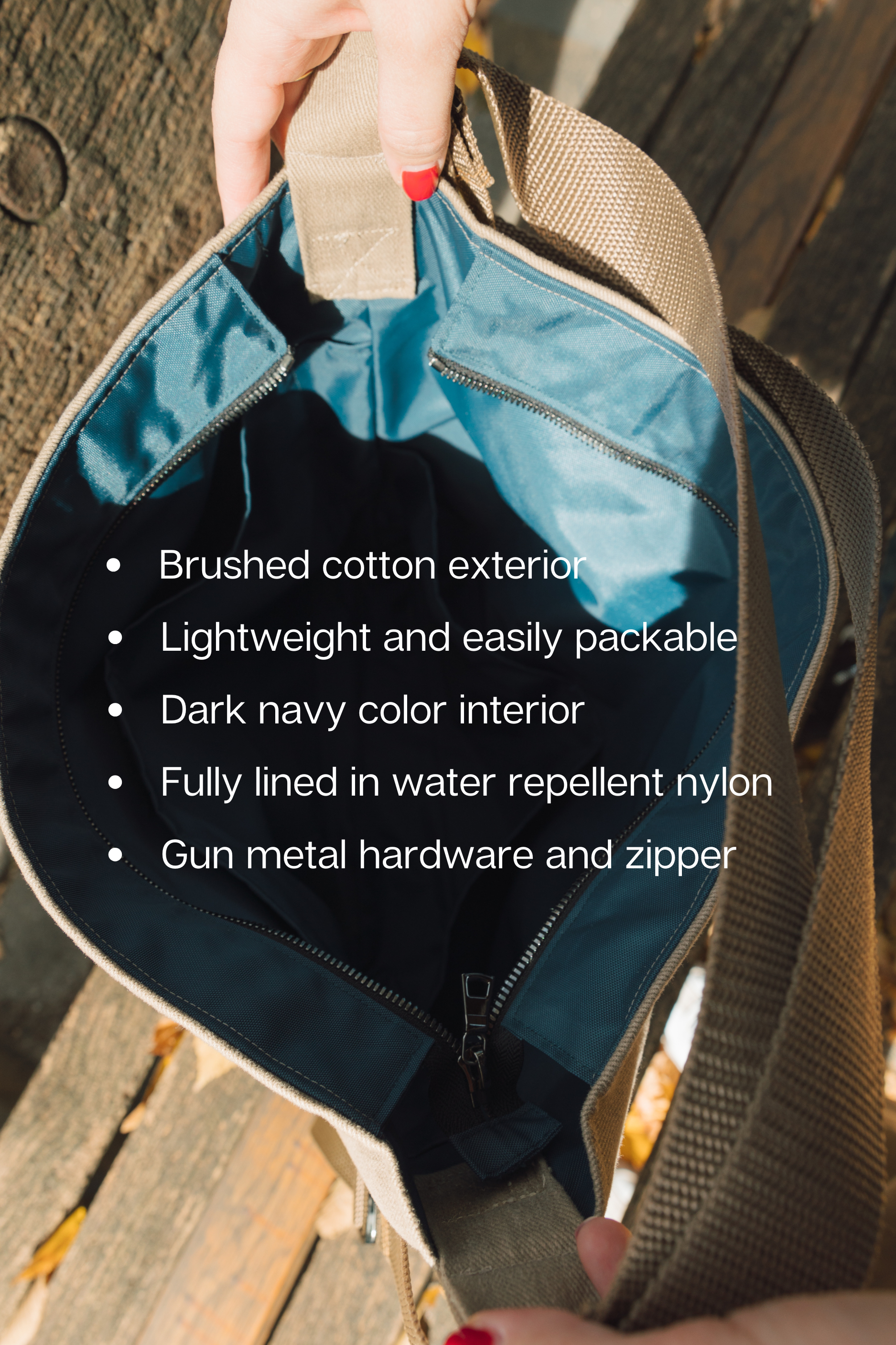 Bring GIOIA with you everywhere. The lightweight cotton fabric makes this bag easy to fold up and pack away in a suitcase. Quality materials sourced in America. Made in Kansas City.